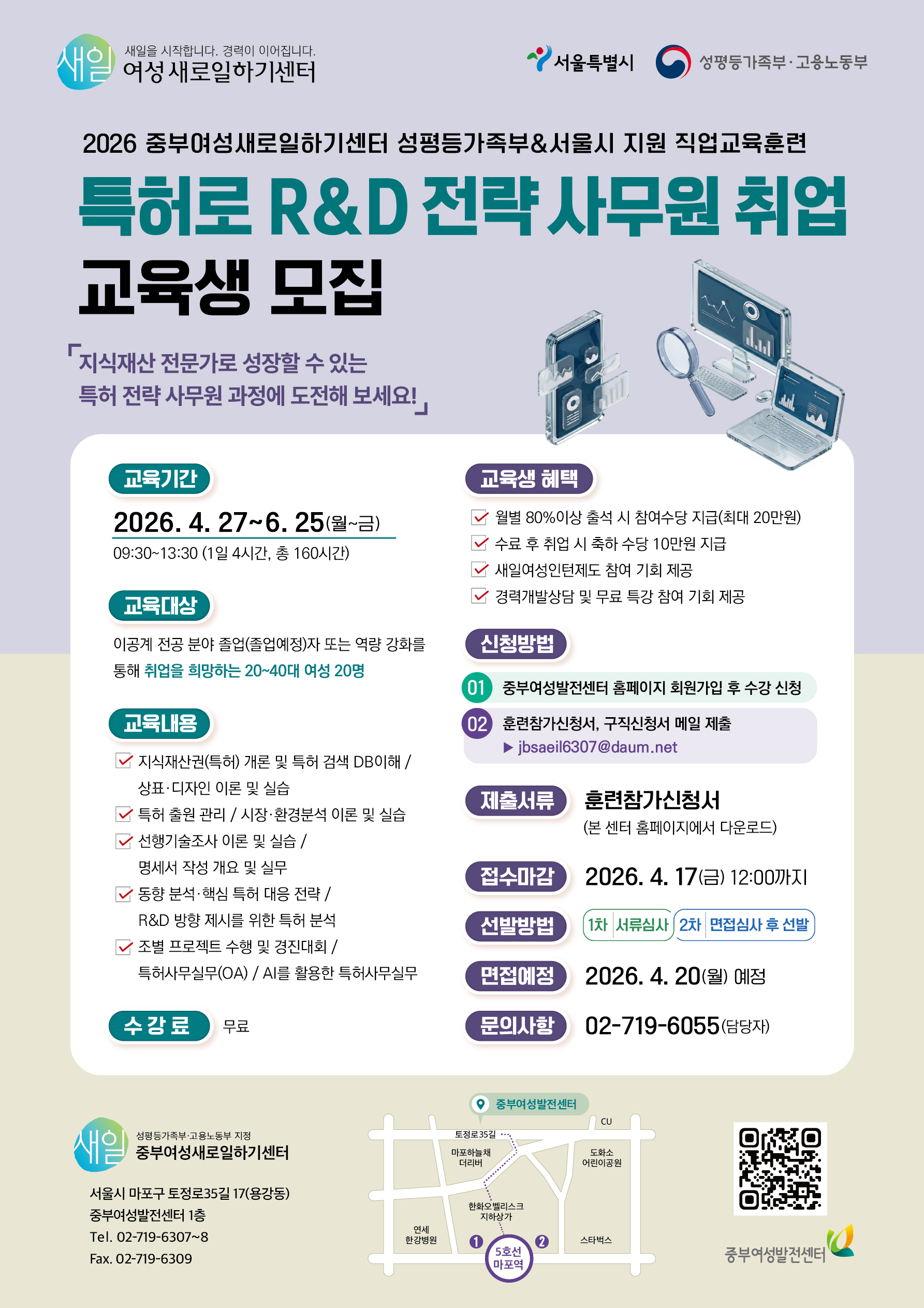 [서울시중부여성발전센터] 직업교육훈련 '특허로 R&D 전략 사무원 취업' 과정 (~4/17)