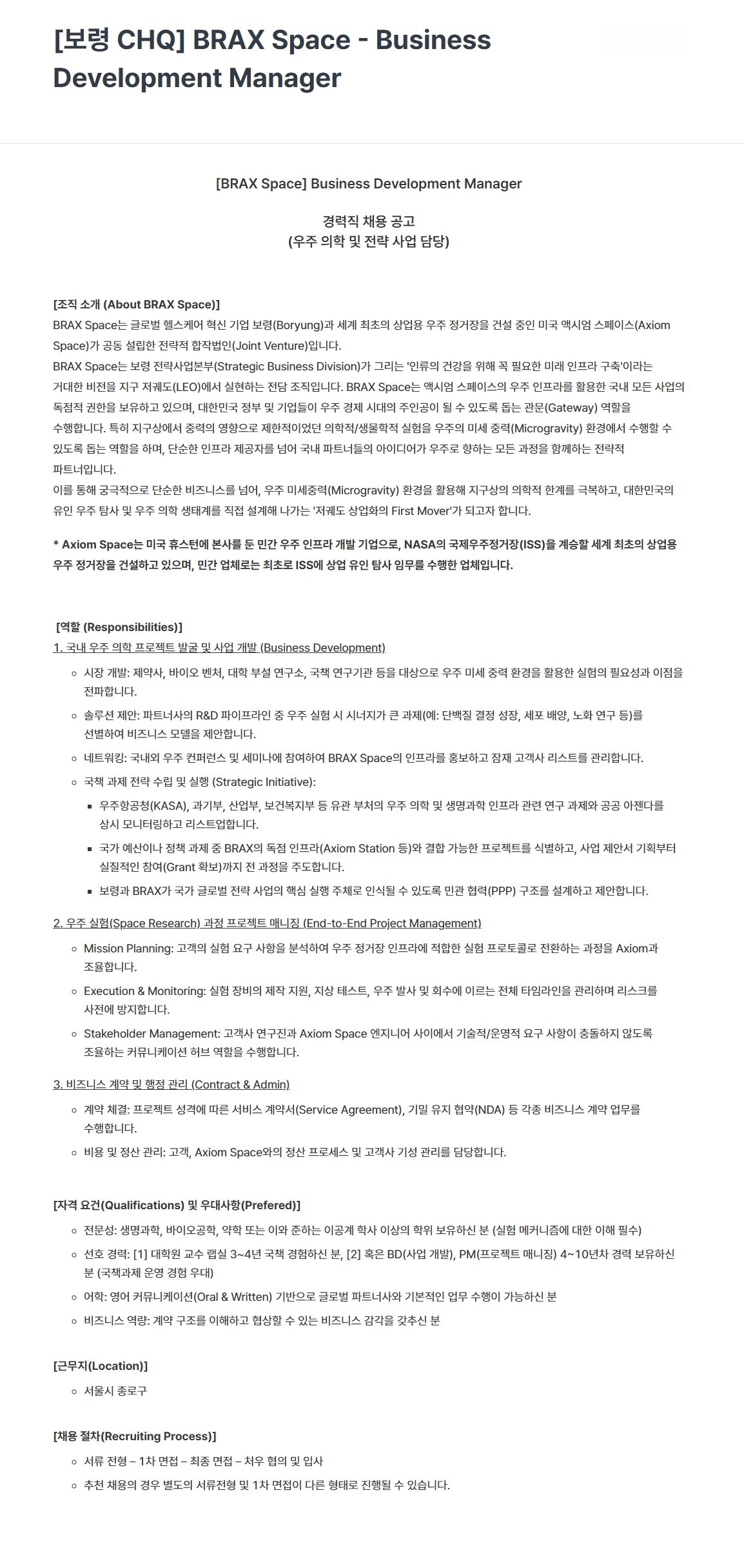 - 선호 경력: [1] 대학원 교수 랩실 3~4년 국책 경험하신 분, [2] 혹은 BD(사업 개발), PM(프로젝트 매니징) 4~10년차 경력 보유하신 분 (국책과제 운영 경험 우대)